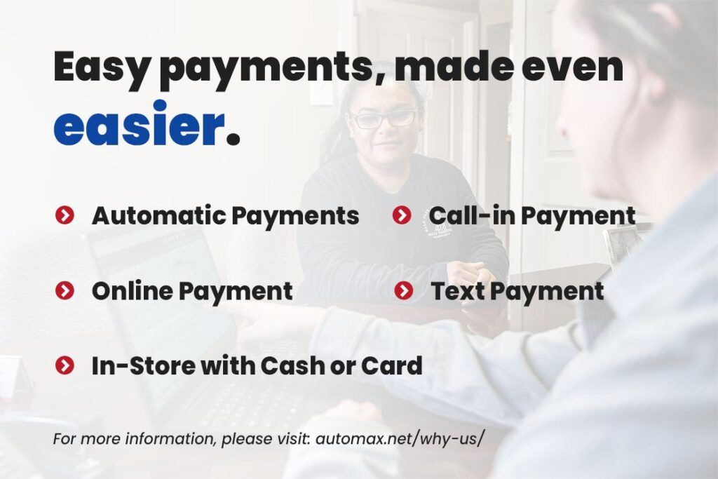 Example of terms: Our average loan term is 36 months. For every $1,000 financed over a 36-month term you will pay $40.29. 100% of the cars sold at AutoMax are financed using our Buy Here Pay Here method. The price is clearly displayed on the website and the window sticker on each vehicle. The down payments and corresponding biweekly payments are for illustration purposes only and are meant to be used as a guide when shopping for a vehicle. This guide shows customers what the down payment and biweekly payments would be and are meant to be used when the customer is considering affordability. We use these examples to show how increasing down payment and extending the term of the loan will lower the biweekly payment. Down payments listed are with approved credit only, not all customers will qualify for the lowest down payment. There is a $399 document fee on each deal. Financing is offered at 25.99% annual percentage rate (APR) regardless of term, down payment and credit score. Customers may negotiate down payment and term, but the price and APR are non-negotiable. All pricing and details are believed to be accurate, but we do not warrant or guarantee such accuracy, and we reserve the right to make corrections at any time. Call us for complete vehicle specific information.
